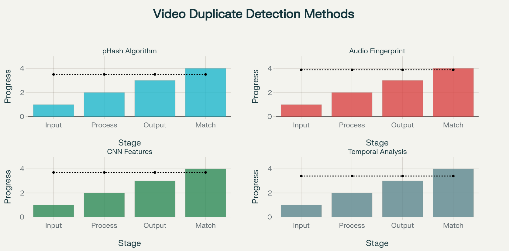 时序一致性分析是检测视频搬运的另一个重要维度。该技术通过分析视频帧之间的时间关系和动作连续性来识别重复内容。双层检测方法(Dual-level Detection)是这一领域的重要突破,包括视频编辑检测(VED)和帧场景检测(FSD)两个层面。