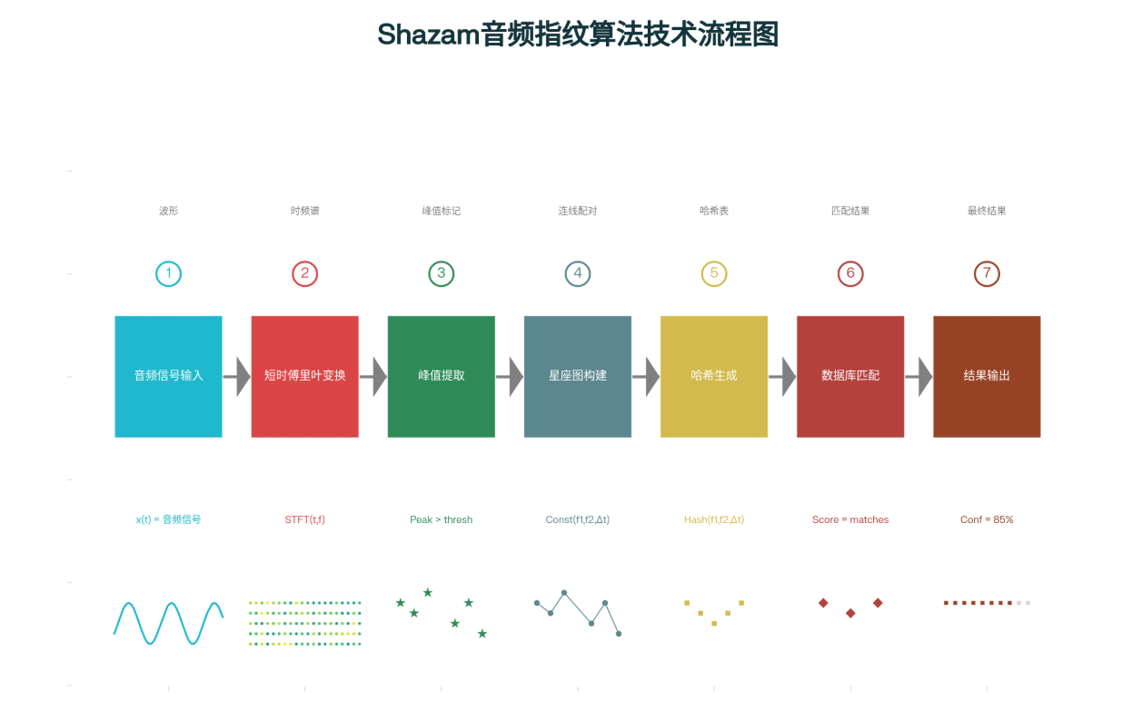 音频指纹的生成过程包括:首先对音频进行44.1kHz采样,然后通过**短时傅里叶变换(STFT)**生成频谱图。系统会从频谱图中提取峰值点,这些峰值代表了音频信号中最显著的频率成分。接下来,算法将这些峰值点配对形成"星座图",每个配对包含两个频率值和它们之间的时间差:。